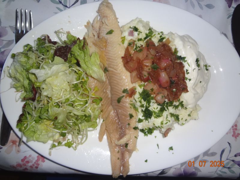 Selbstgeräuchertes Forellen-Filet, Kart.-Püree mit Creme, Eichblattsalat mit Sprossen |