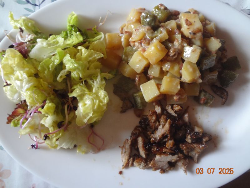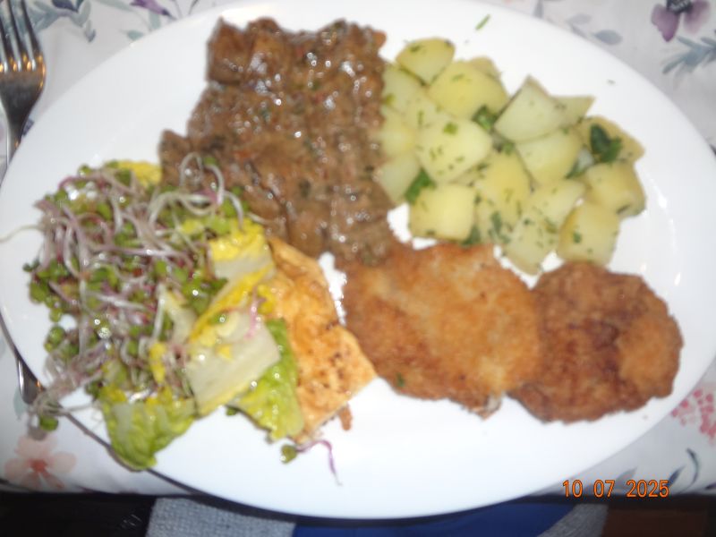 Rindergulasch a la Opa, Pet.-Kart., Lollo-Rosso-Salat mit Radieschen-Sprossen |