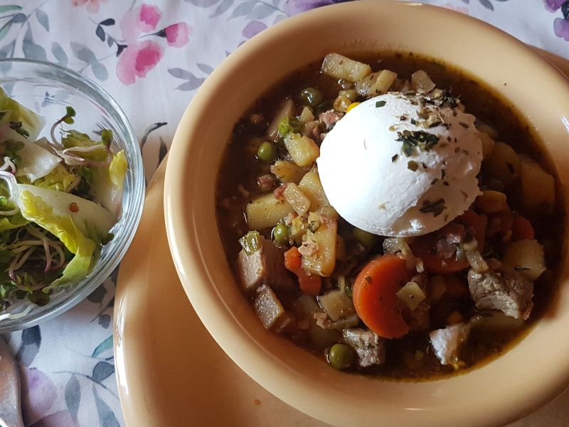 Eintopf mit 5 Kräutern und 8 Gemüsesorten in Rinderbrühe, Kart., Schweinefleisch und Schmand, Eichblattsalat mit China-Rose-Sprossen |
