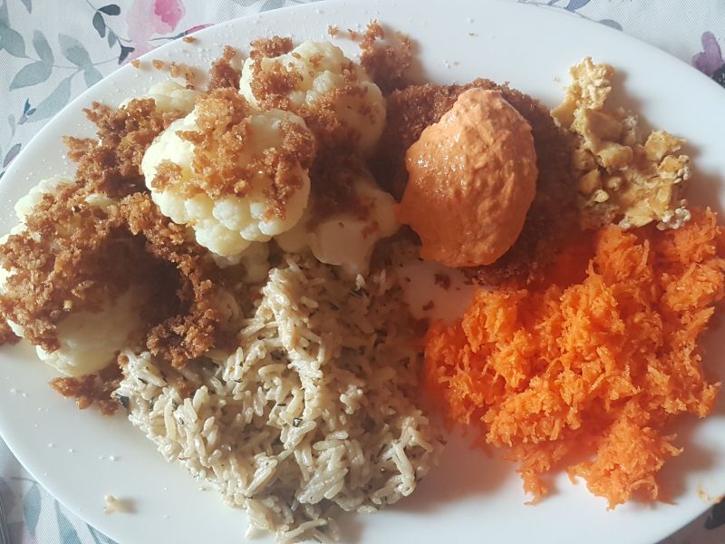 Paniertes Schweine-Filet mit Tomaten-Ajvar-Dip, Blumenkohl mit Panko-Bröseln, Basmatireis in Rinderbrühe gegart, Möhrensalat |