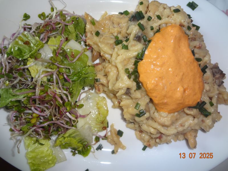 Spätzle mit sehr dünn (2mm) geschnittenen Hähnchenfilet-Scheiben, Bacon, Champignons, Zwiebeln, geriebenem Käse, Rinderbrühe und Sekt-Reduktion, Schmand-Ajvar-Tomaten-Dip, Salatherzen mit Alfalfa-Sprossen |