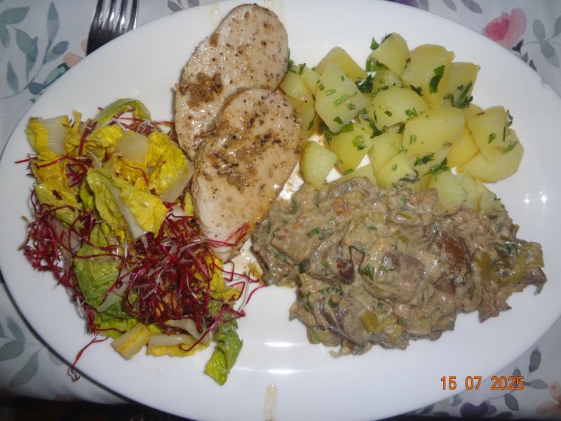 Nackensteak, Ajvar-Tomatenmark-Schmand-Dip, Pilz-Gemüse in Sekt-Schmand-Soße, Pet.-Kart., Lollo-Bionda-Salat mit Alfalfa-Sprossen |