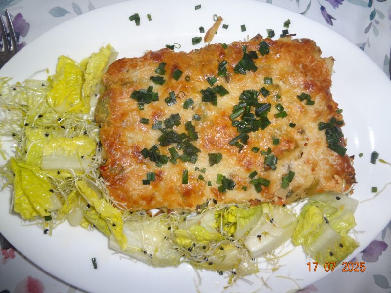 Schichtauflauf mit Kart., selbstgeräuchertem Lachs, Champignons und geriebenem Käse, Feldsalat mit Sprossen |