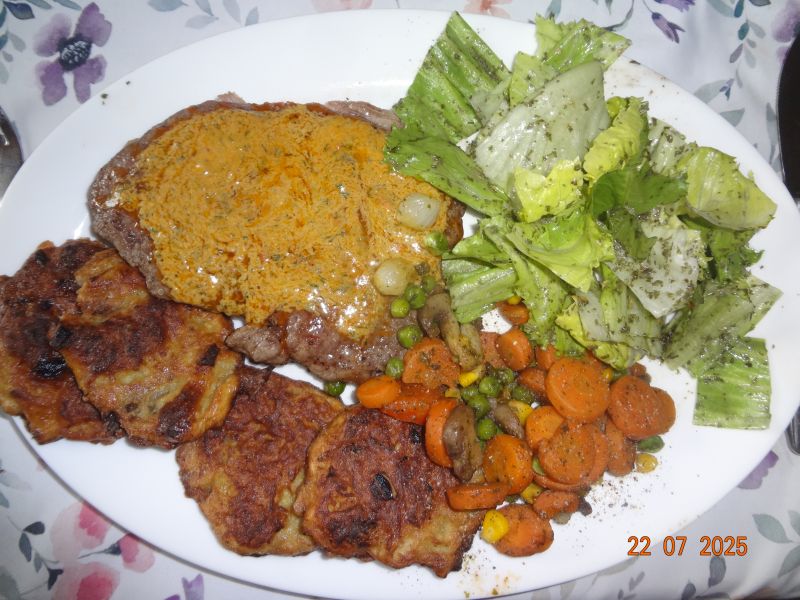 Entrecôte mit Café-de-pari-Butter, Kart.-Puffer, französisches Mischgemüse, Eisbergsalat mit Salatkräutern |