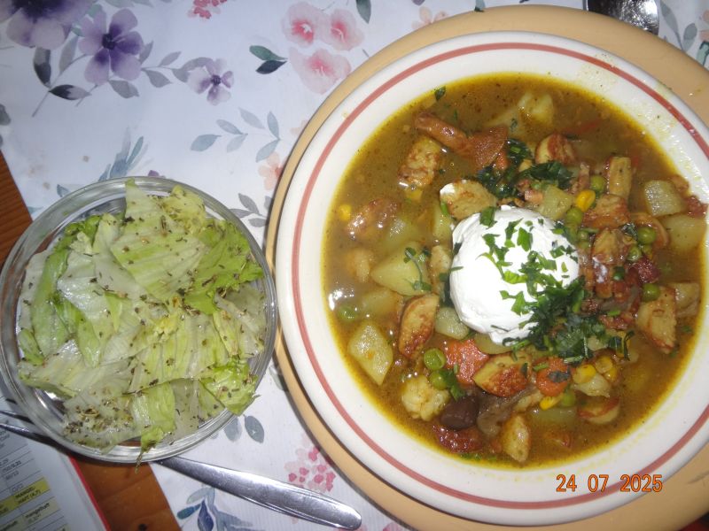 Eintopf in Rinderbrühe mit Bratwurst-Würfeln, Garnelen, Waldpilzen, gemischtem Gemüse, Bacon, und Zwiebeln(*), Eisbergsalat mit Kräutern der Provènce |
