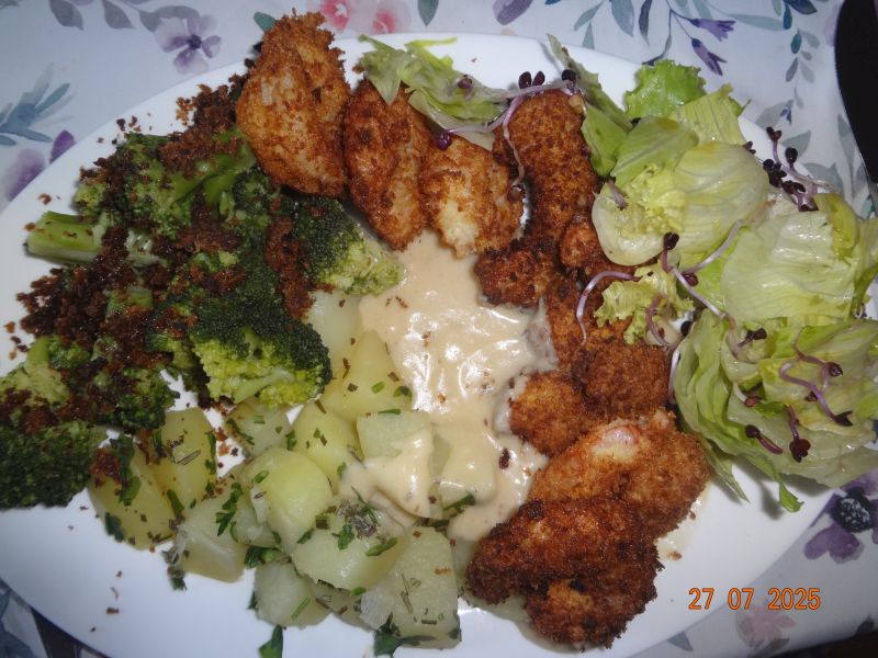 Gegrillte, panierte Garnelen, gedünsteter Broccoli mit Bröseln, Sekt-Schmand-Soße, Pet.-Kart.(*), Eisbergsalat mit Radieschen-Sprossen |