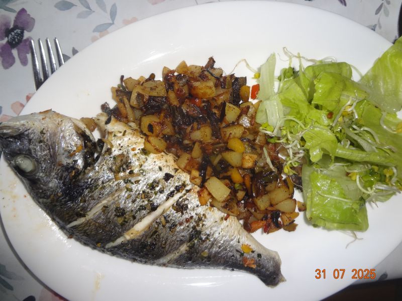 Kräuter-Dorade, Gemüse-Kart.-Würfel, Crispana-Salat mit Sprossen |