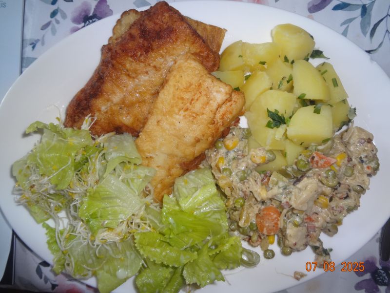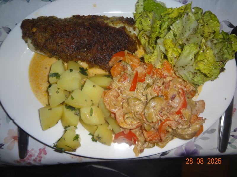 Kräuter-Dorade mit Kart. und Möhren, Gemüse-Salat mit Mozzarella |