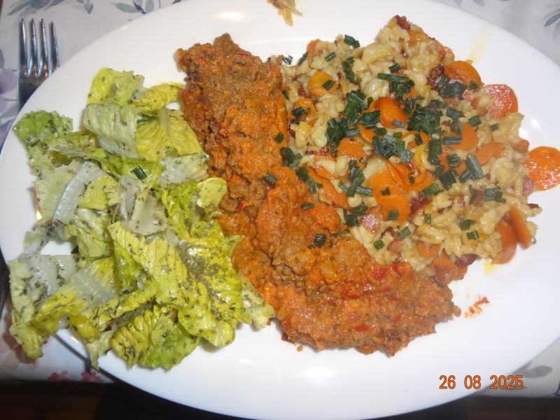 Schweinenacken-Rouladen, Paella-Rest, Kart.-Sellerie-Stampf, Feldsalat mit Kräutern der Provence |