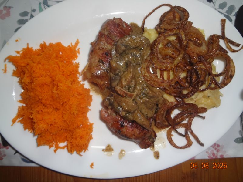 Kalbs-Medaillons im Speckmantel (*), Champignons, frittierte Zwiebeln, Kart.-Sellerie-Stampf, Möhrensalat |