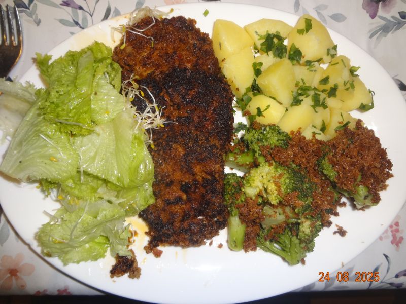 Paniertes Hähnchenbrust-Filet, gemischtes Gemüse mit Waldpilzen, Pet.-Kart, Rucola-Salat mit Radieschensprossen |