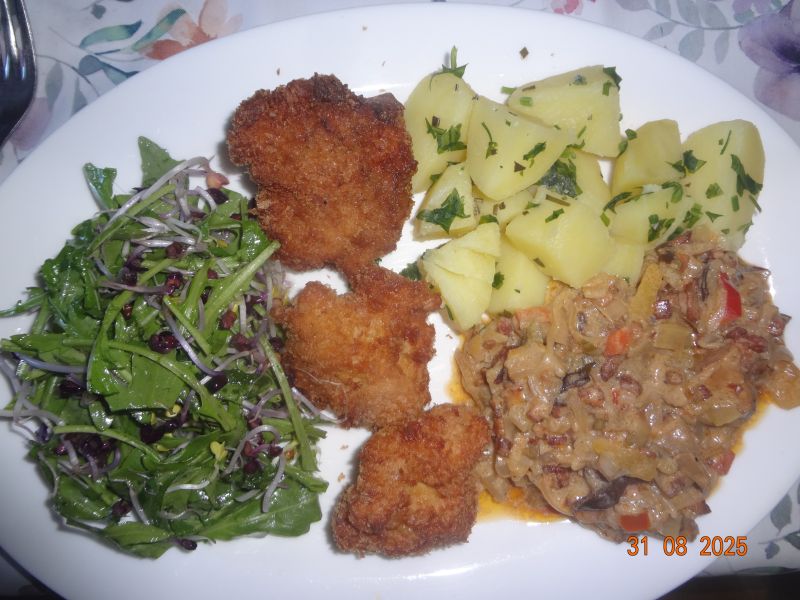 Paniertes Kasseler-Nackensteak, Champignons in Sekt-Schmand-Soße, Pet.-Kart., Salat mit Rotkohl-Sprossen |
